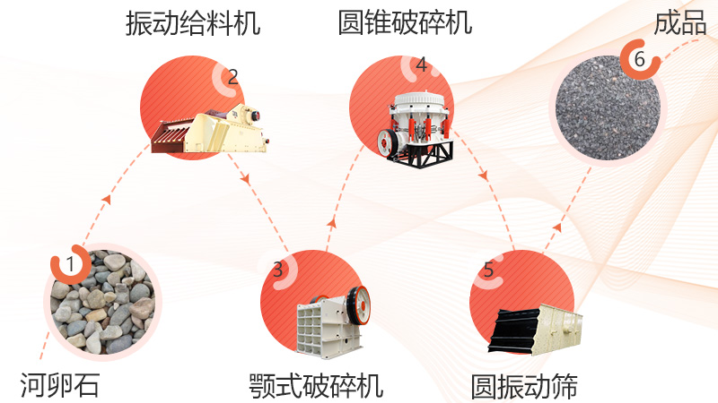 篩分機篩分出的不符合規格的河卵石要重新返回圓錐破碎機中再次破碎機,直到符合成品規格的要求。