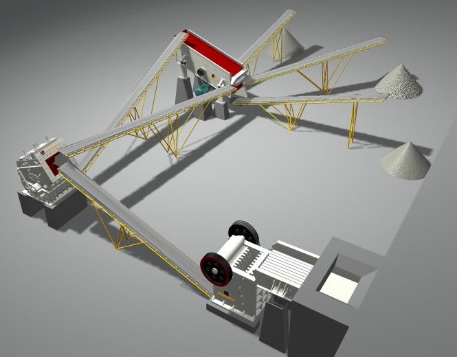 石子破碎生產(chǎn)線(xiàn)的生產(chǎn)流程大致為:(料倉(cāng))->振動(dòng)給料機(jī)->鄂式破碎機(jī)->反擊式破碎機(jī)->振動(dòng)篩->(成品石料),各設(shè)備中間以溜槽或皮帶輸送機(jī)相連。