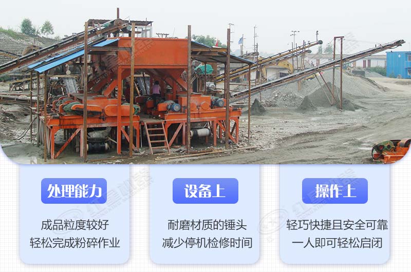 2、從設備耐磨性方面來說,雙級破碎機選用的是高合金耐磨材質打造的錘頭,一副可頂三副使用,可大大減少停機檢修時間。