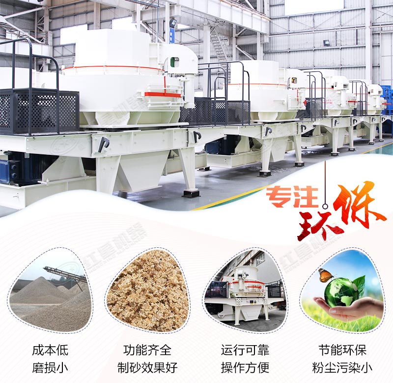 制沙設備的制砂過程中,主要是將物料放入破碎腔內,由破碎部件進行敲打、沖擊、研磨等方式。使物料制成所需粒度,由排料口排口,即為成品。在整下破碎過程中,物料相互自行沖擊破碎,不與金屬元件直接接觸,而是與物料襯層發生沖擊、磨擦而粉碎,這就減少了角污染,延長機械磨損時間,提高整機壽命。